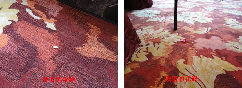 白云厅、罗浮厅、丹霞厅的窗帘有很严重的烟味和食物的味道,角落里有难闻的臭味, 厅内挥发性气体的味道很浓,其中丹霞厅的挥发性气体的味道最为严重。