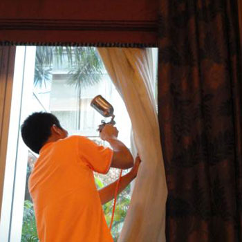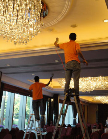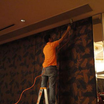3、表面清洁,用干净的拖把将宴会厅的表面(除玻璃这外)擦一遍,用吸尘机将地毯上的脏物清理掉,主要目的去除表面的尘埃,确保光触媒涂层的粘着能力,以免影响其效果;