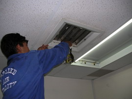 在风管开一个洞以便将机器人放入风管进行清洗 银康处理后测量风速,以确保工程质量