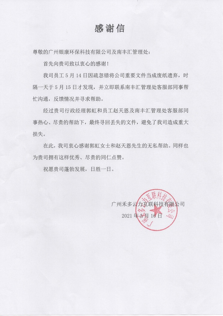 收到南丰汇大厦写字楼层租户的感谢信