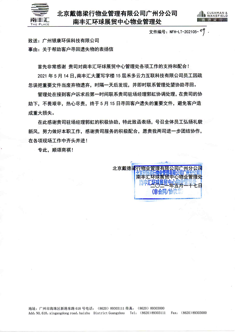 收到北京戴德梁行物业管理有限公司广州分公司南丰汇环球展贸中心物业管理处的表扬信