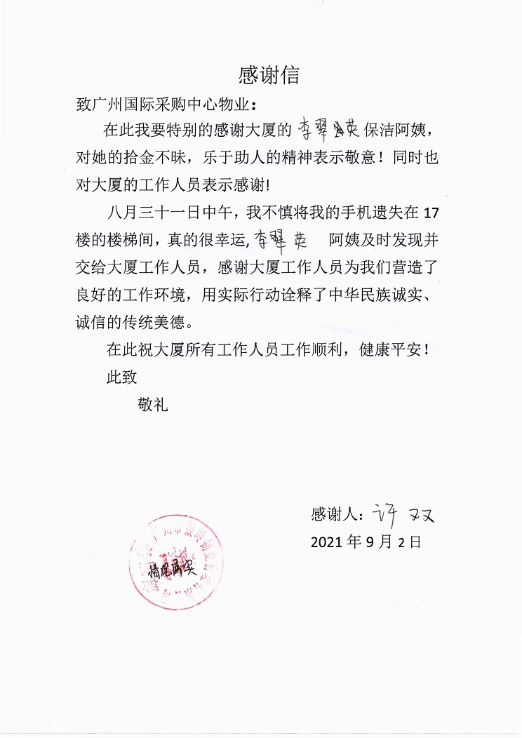 收到广州国际采购中心写字楼业主的感谢信