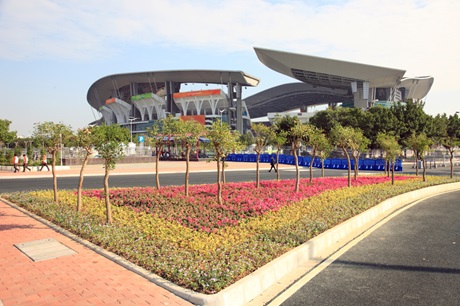 体育场的设计由美国NEB与华工建筑设计研究院共同完成,是广州市标志性建筑之一。广东奥林克体育中心为承办中国九运会而投资16.7亿元人民币兴建的现代化体育场馆。在国内首创缎带式屋顶设计。21个色彩各异的看台区像一片片花瓣,合起来一看,广州市市花--木棉花,赫然入目,更被评为羊城新八景之一,名曰"五环晨曦"。